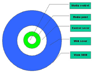ViaM5000 是一款新型MCU,完全符合H.323v2标准。该款产品集图象、声音、数据及控制等媒体功能于一体,新增了网关守卫、内置及外挂流服务器、图象台等功能。硬件组成简单、明了,结构紧凑,整个系统易于扩展。总体上形成了一种贴近用户、贴近应用、人性化、个性化的风格